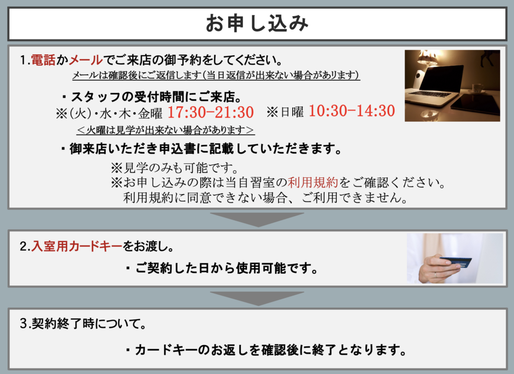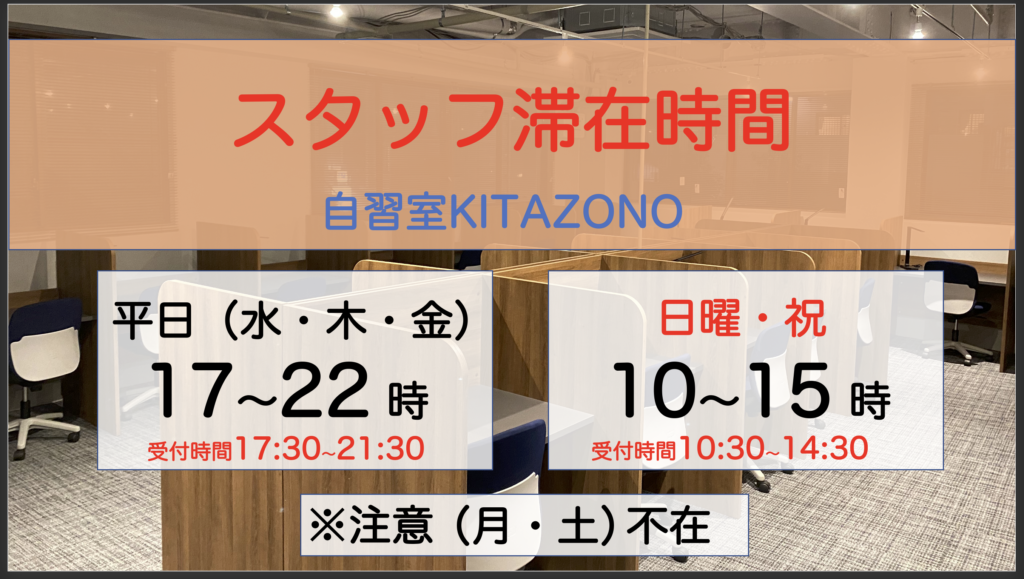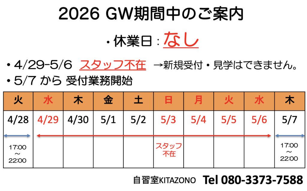 2026.4.29 (最新情報) ・4月29日-5月6日 GW期間中はご利用できます。 自習室電話 080-3373-7588 氏名 メールアドレス 題名 電話番号 (必ずご記載下さい) メッセージ本文 (任意) Δ メッセージ内容 ・見学御希望日時 ・料金プランの質問など https://www.instagram.com/kitazono_studyroom